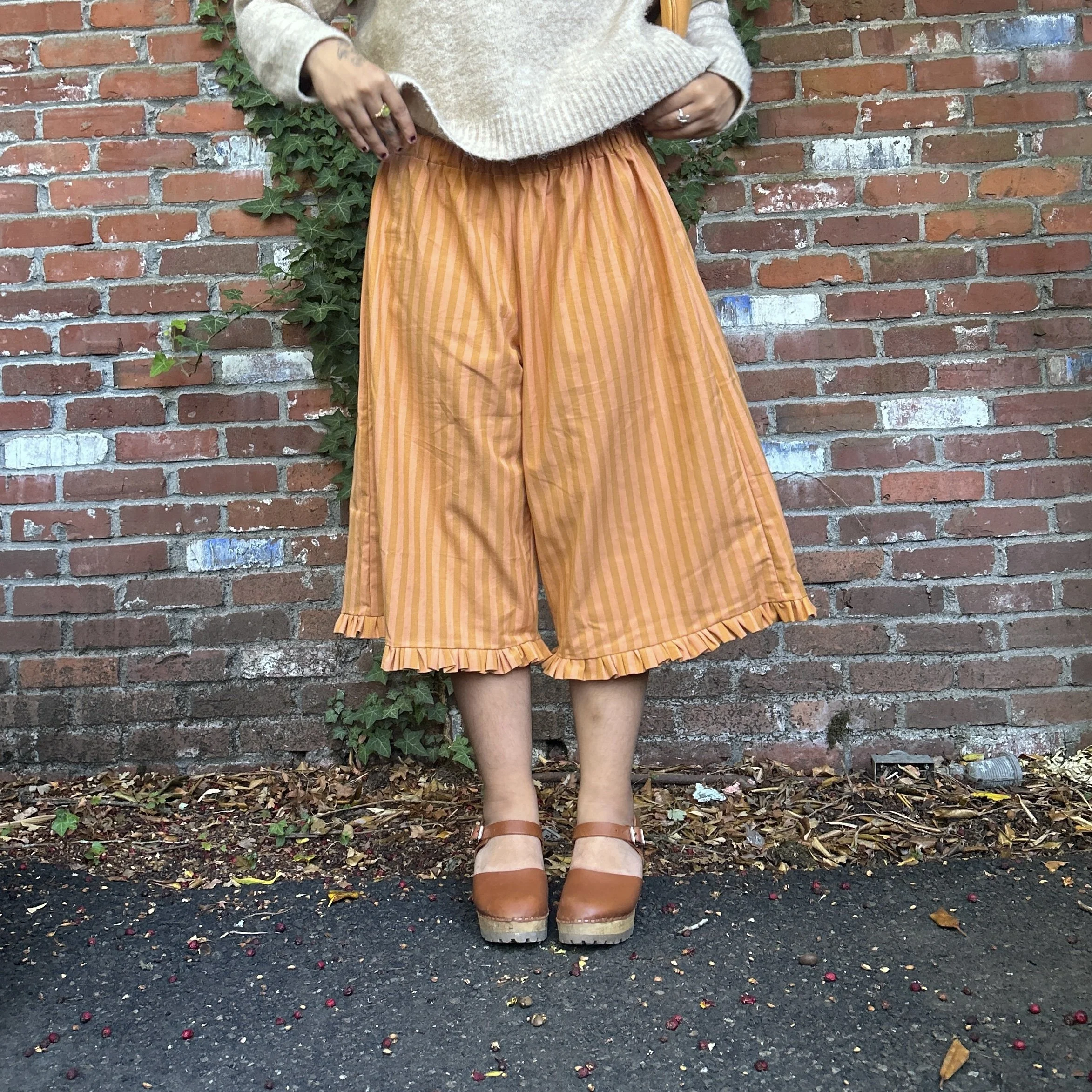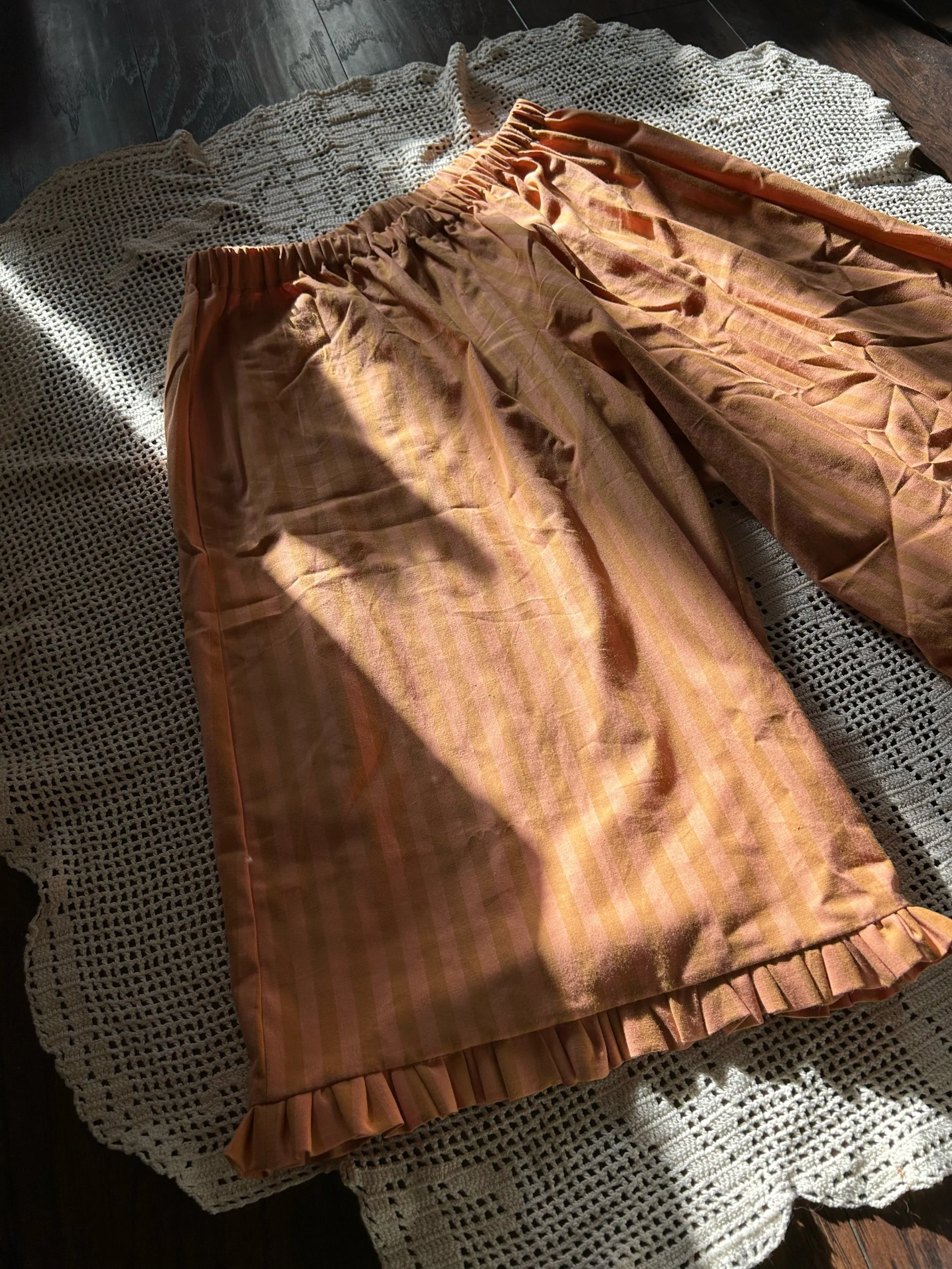 These are ruffled culotte cuties made from 100% cotton! Made from a soft and lightweight tan and mauvey fabric. I love these for autumn layering, they’re just the right amount of cozy. Pair with tall boots or fun flats!